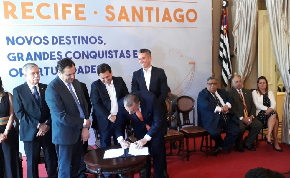 Anúncio do voo entre Recife e Santiago foi feito nesta terça (3), durante cerimônia na sede do governo de Pernambuco (Foto: Marina Meireles/G1)
